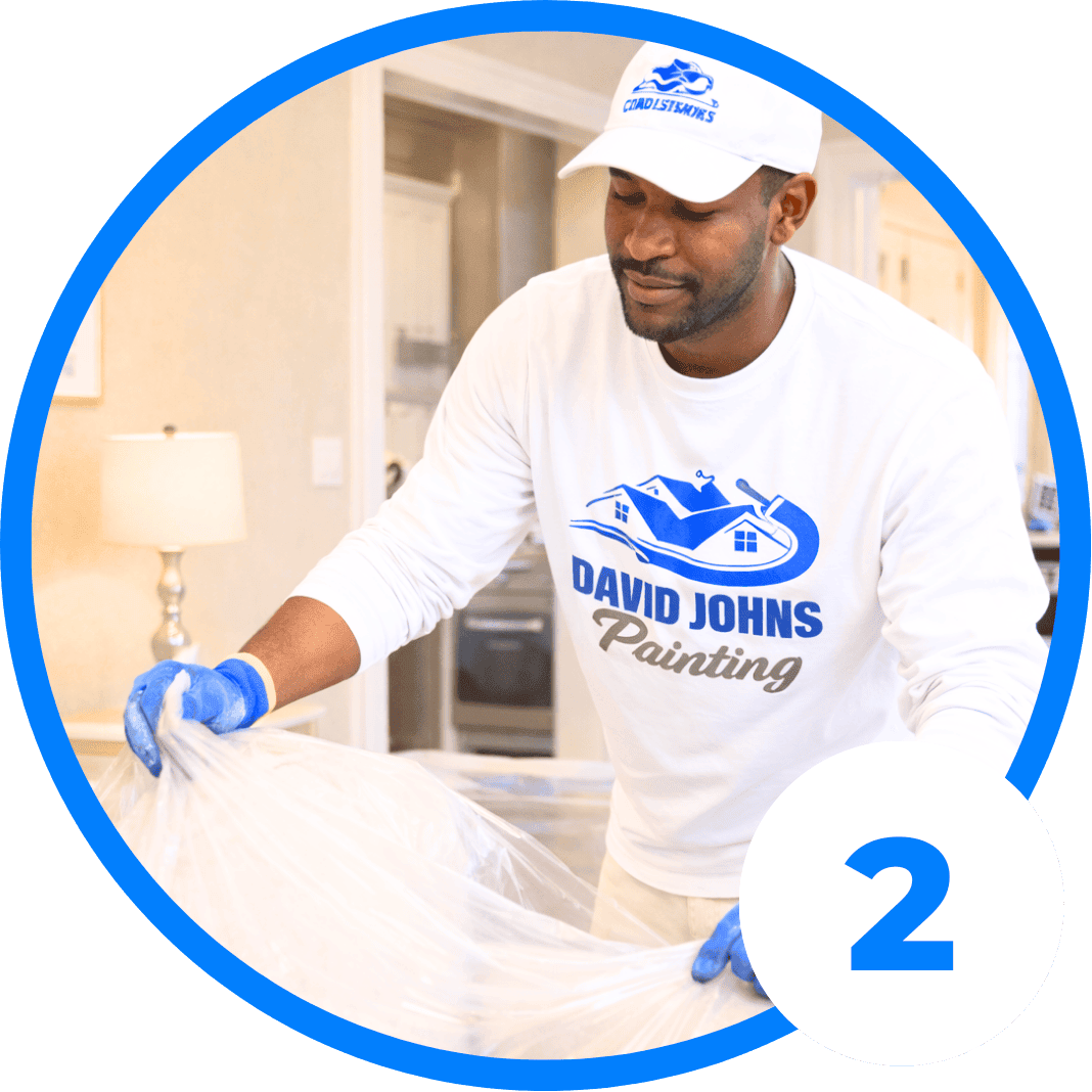 We meticulously mask every edge and cover all furniture to ensure a spotless, mess-free environment.